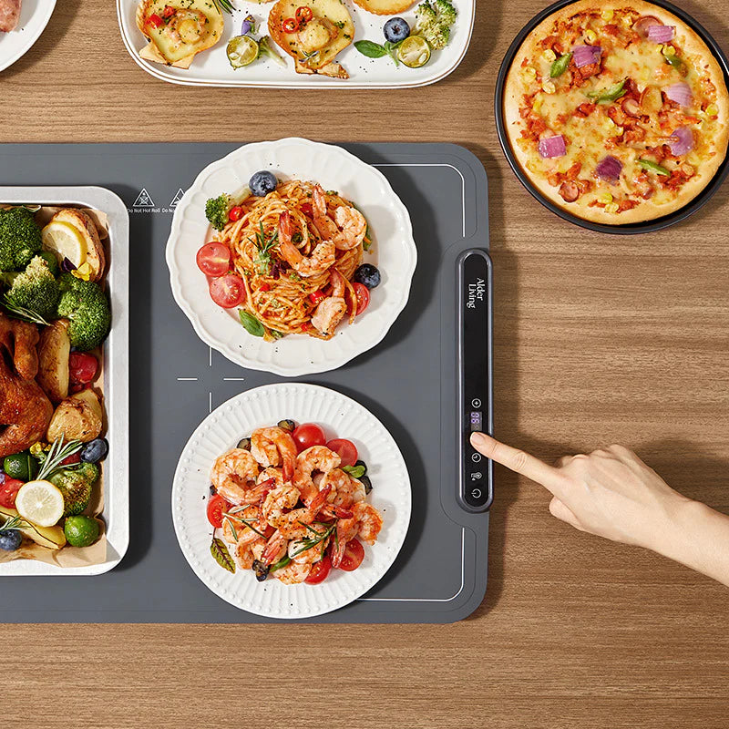 This innovative food warming mat is designed to keep your dishes perfectly warm. With customizable temperature and timer settings, it adapts effortlessly to any meal or occasion. Crafted with a rollable, easy-to-clean silicone surface and elevated foot pads for table protection, it’s compact, durable, and ready to elevate your dining experience.