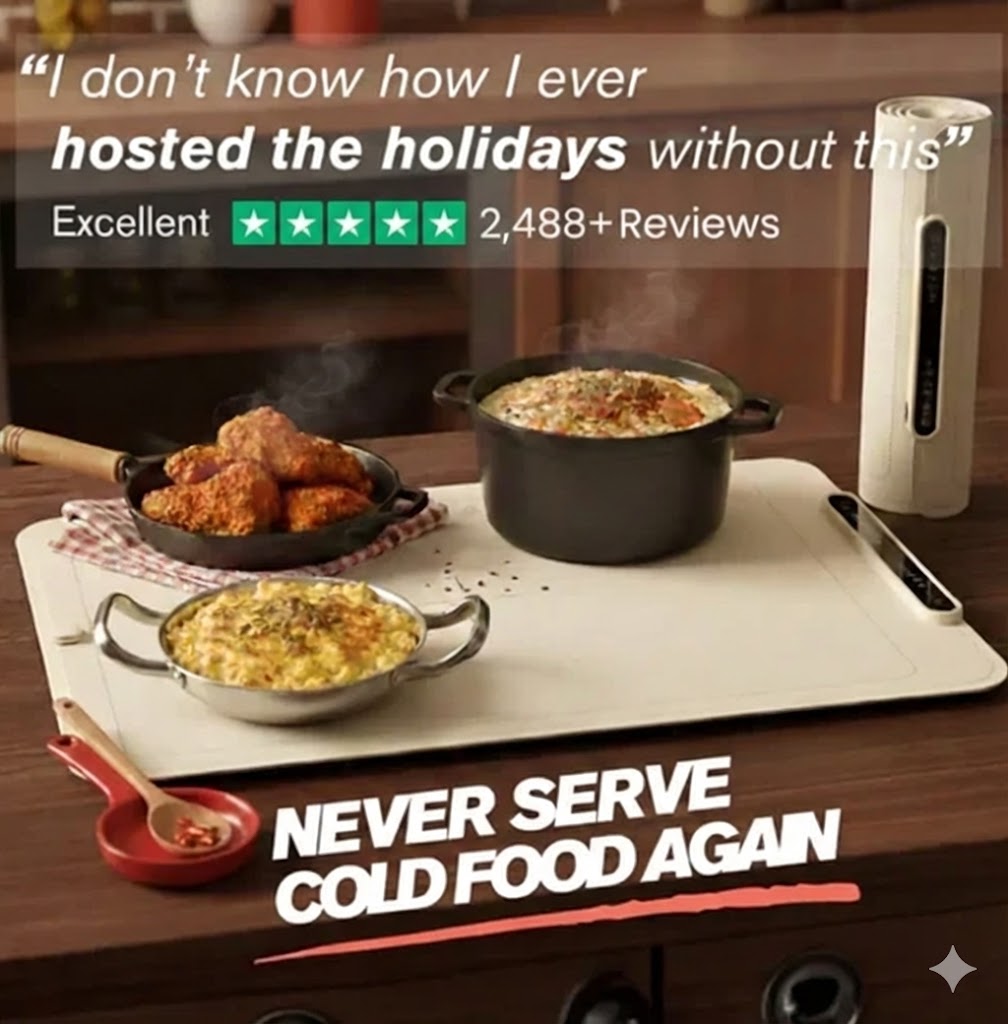Using gentle, self-regulating heat, it keeps your dishes warm for HOURS, no microwave, no reheating, no babysitting your food.